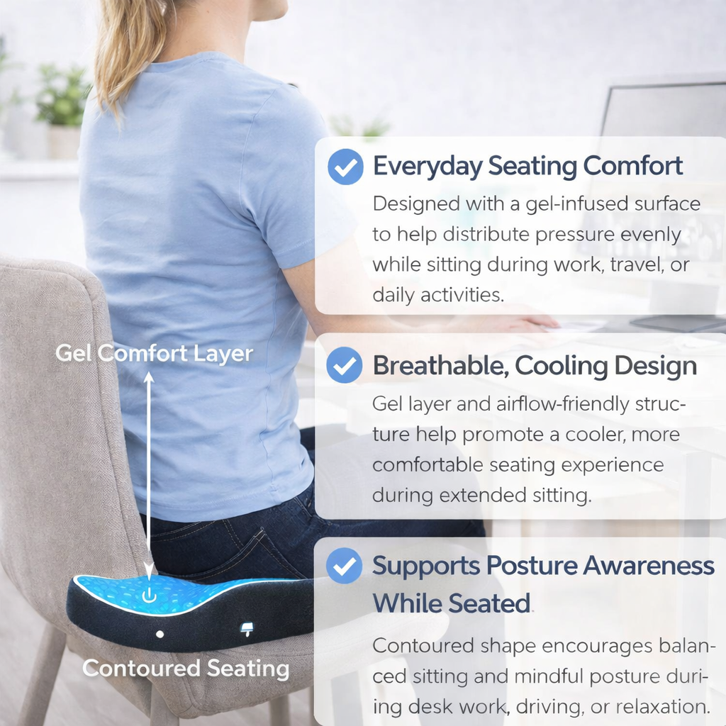 The CoolAlign - Gel & Memory Foam Seat Cushion is an ergonomic seat cushion designed with a combination of gel and foam materials to support everyday sitting comfort. It’s made for use during work, travel, or daily seated activities.