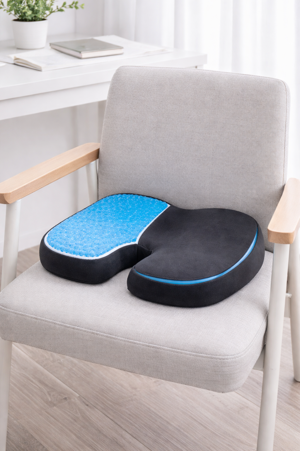 The cushion features a contoured design that helps distribute weight more evenly while seated. The gel layer provides a cooler, comfortable surface, while the foam base offers consistent support during extended sitting.