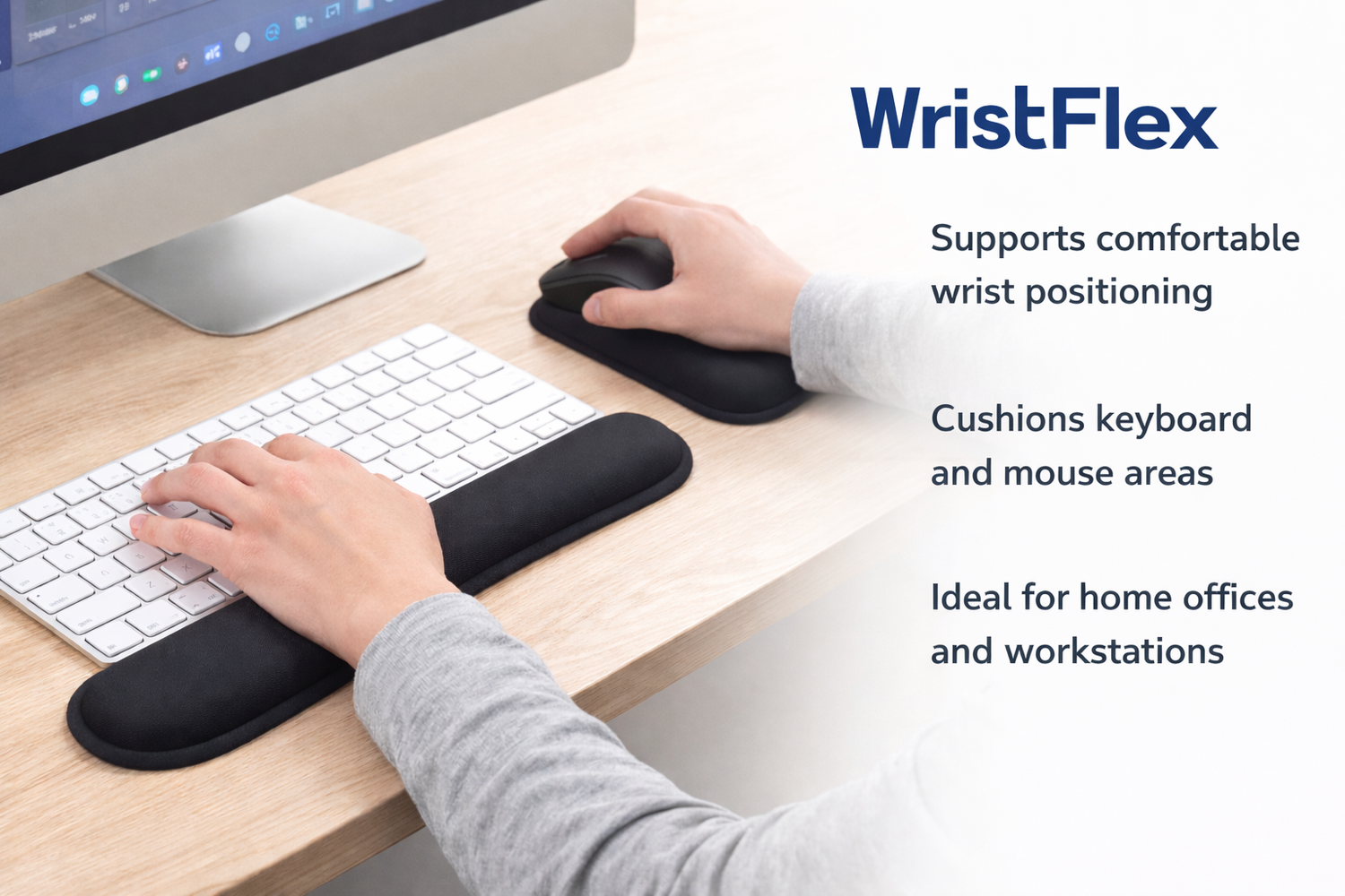 The WristFlex is a keyboard and mouse wrist rest set designed to support comfortable wrist positioning during everyday computer use at home or in the office.