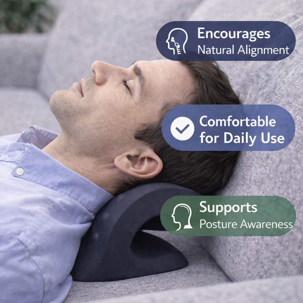 NeckAlign can be used during rest periods, relaxation time, or as part of a daily routine at home. Many people use it while lying on a couch, bed, or floor to support comfortable positioning.